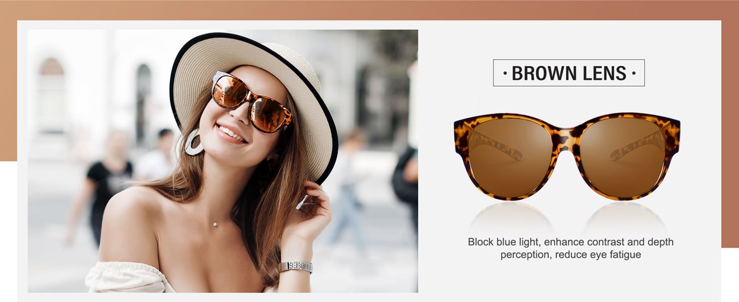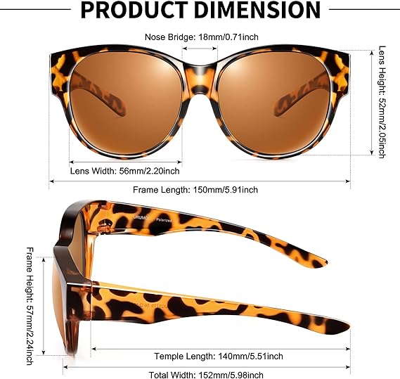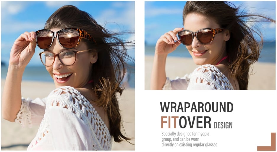 These polarized sunglasses are specially designed for those who wear prescription glasses, large frame and wide temples can well wrap your existing prescription glasses, people who wear contact lenses or with normal vision can also wear them alone