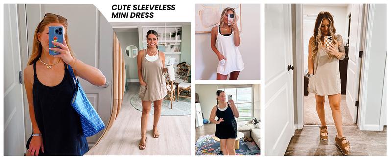 Feature: Scoop neckline, mini-length, two oversized patch pockets at front, thin shoulder straps, sleeveless mini dress for women with built-in shorts, solid color workout mini dress